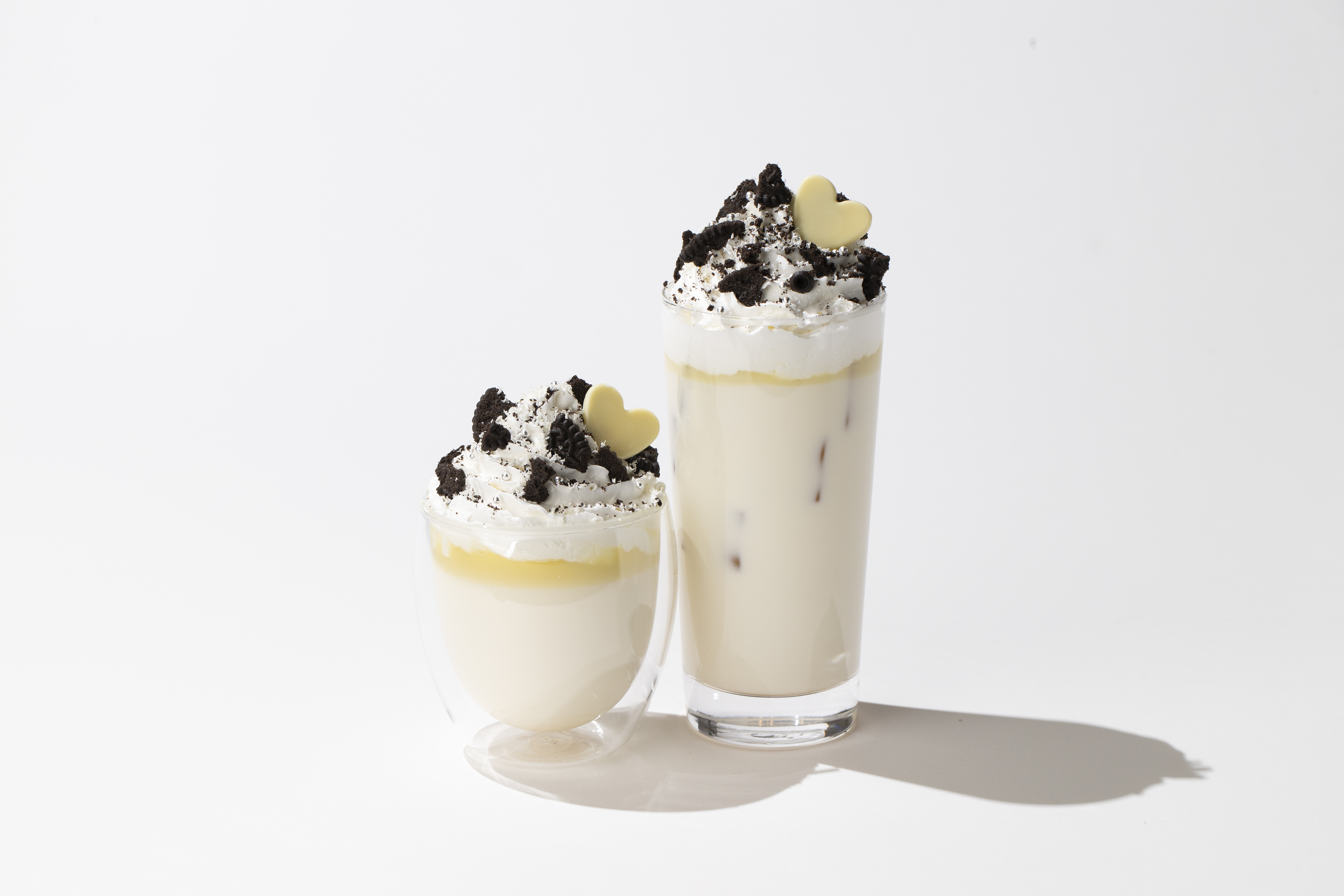 ホワイトチョコレートミルクに、クッキーホワイトクリームとハートチョコを添えて。