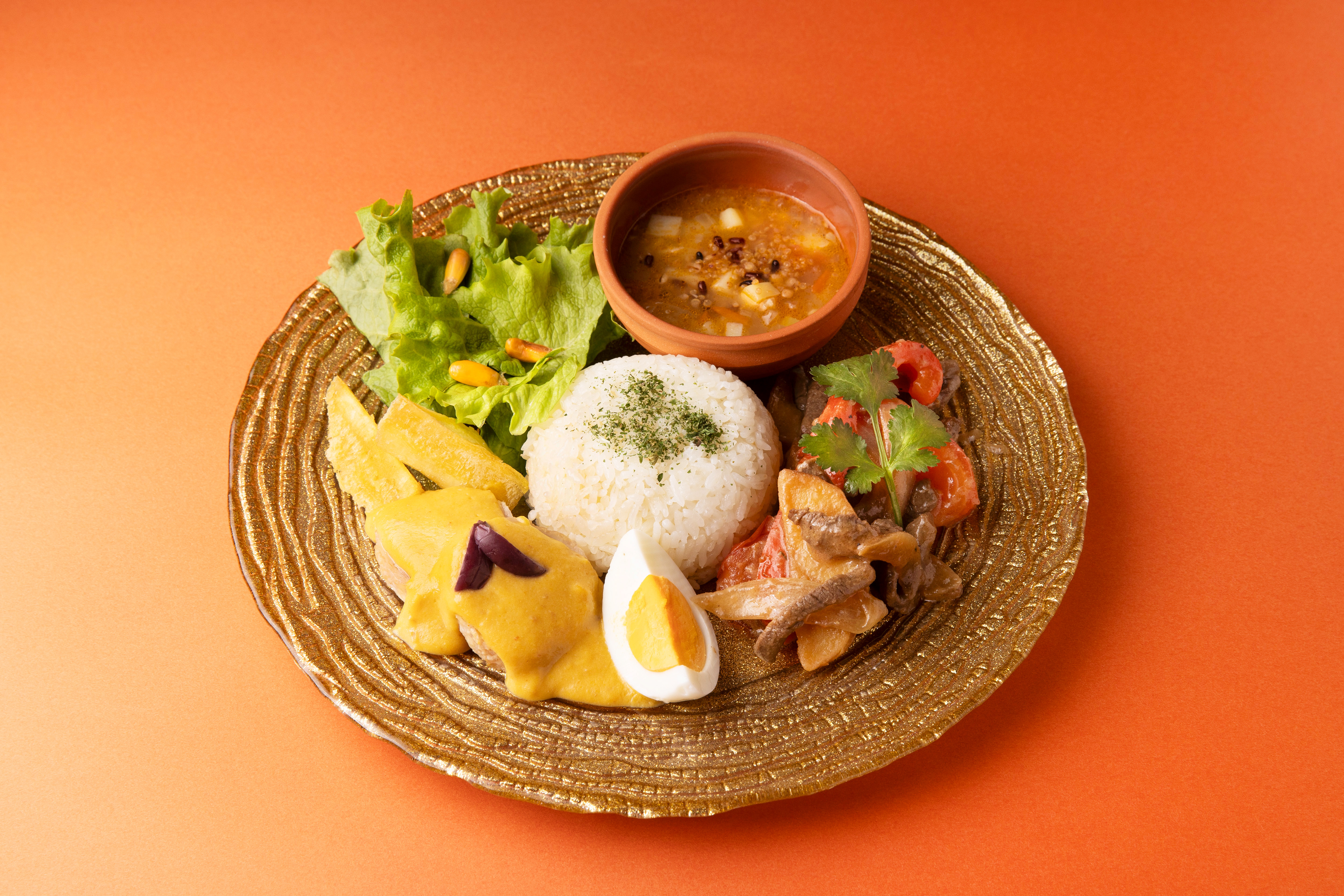 アヒ・デ・ガジーナ、ロモ・サルタード、ソパ・デ・キヌア、ガーリックライスのペルー料理が満喫できるワンプレート。
